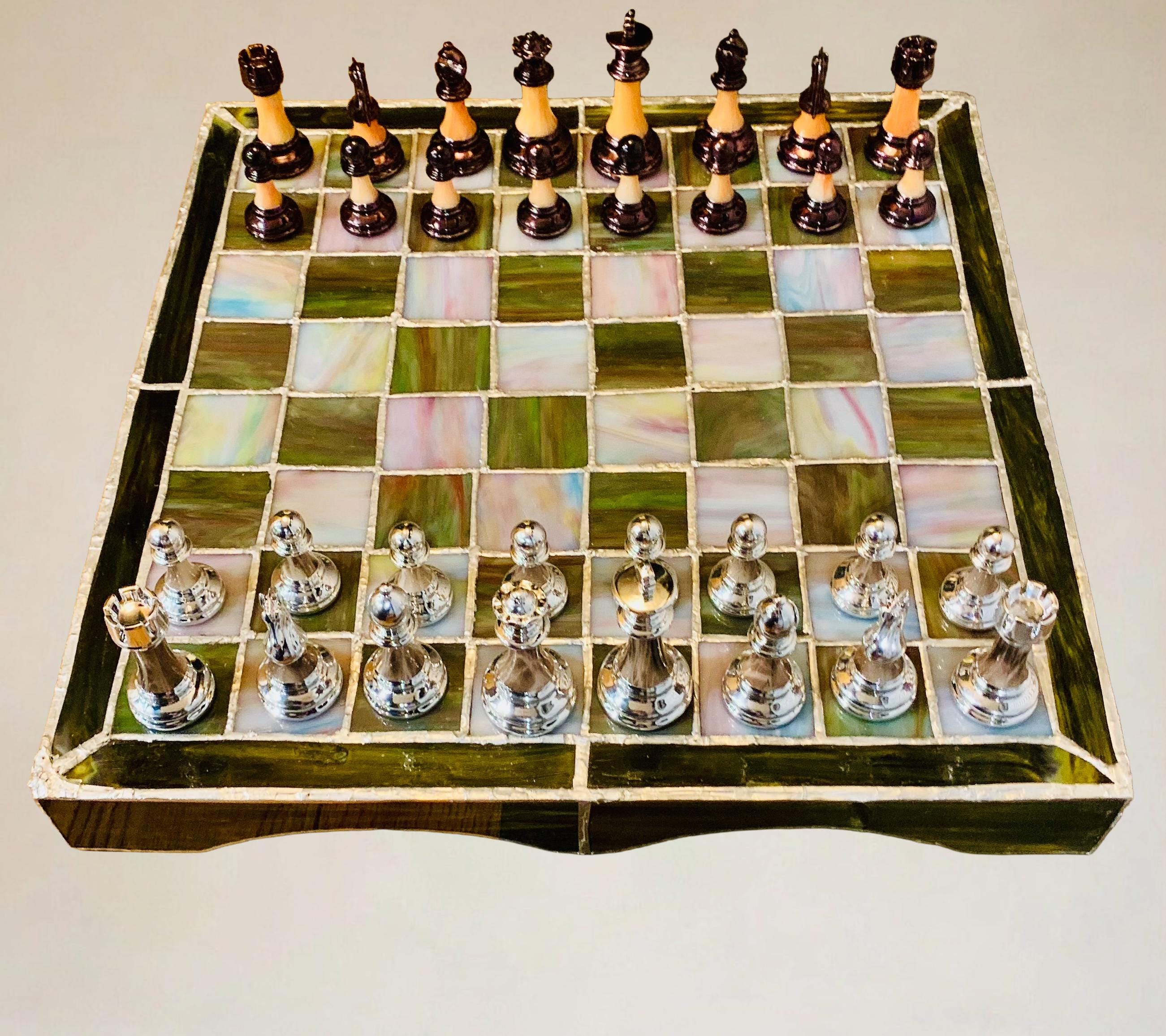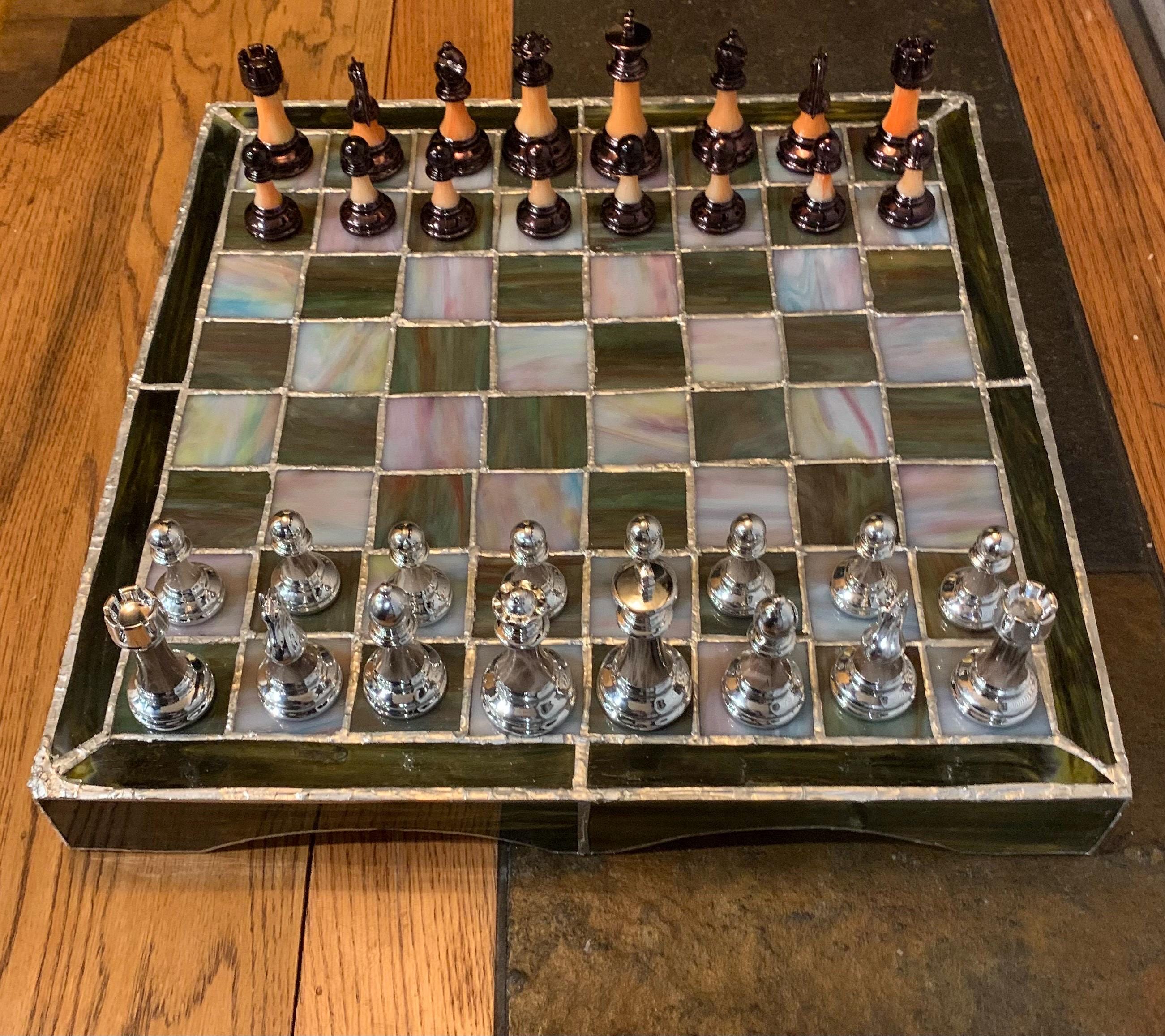 Handcrafted stained glass chessboard, fully playable and built to last. Every square is hand-cut, foiled, and soldered with care.