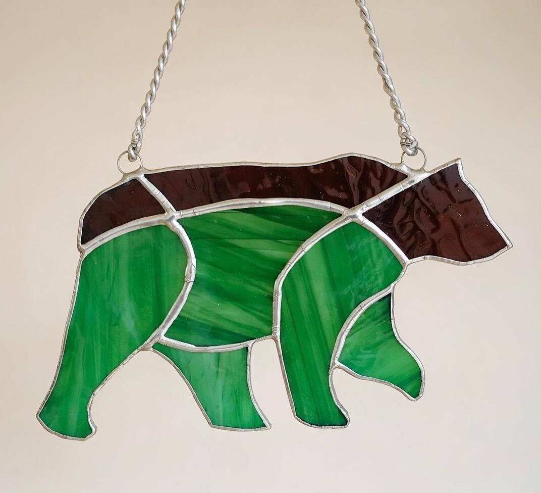 Handcrafted stained glass bear suncatcher. Perfect little touch of the Maine woods for your window, rearview mirror, or anywhere the light hits.• Comes ready to hang with chain + clear suction cup hook• Ships safely protected
