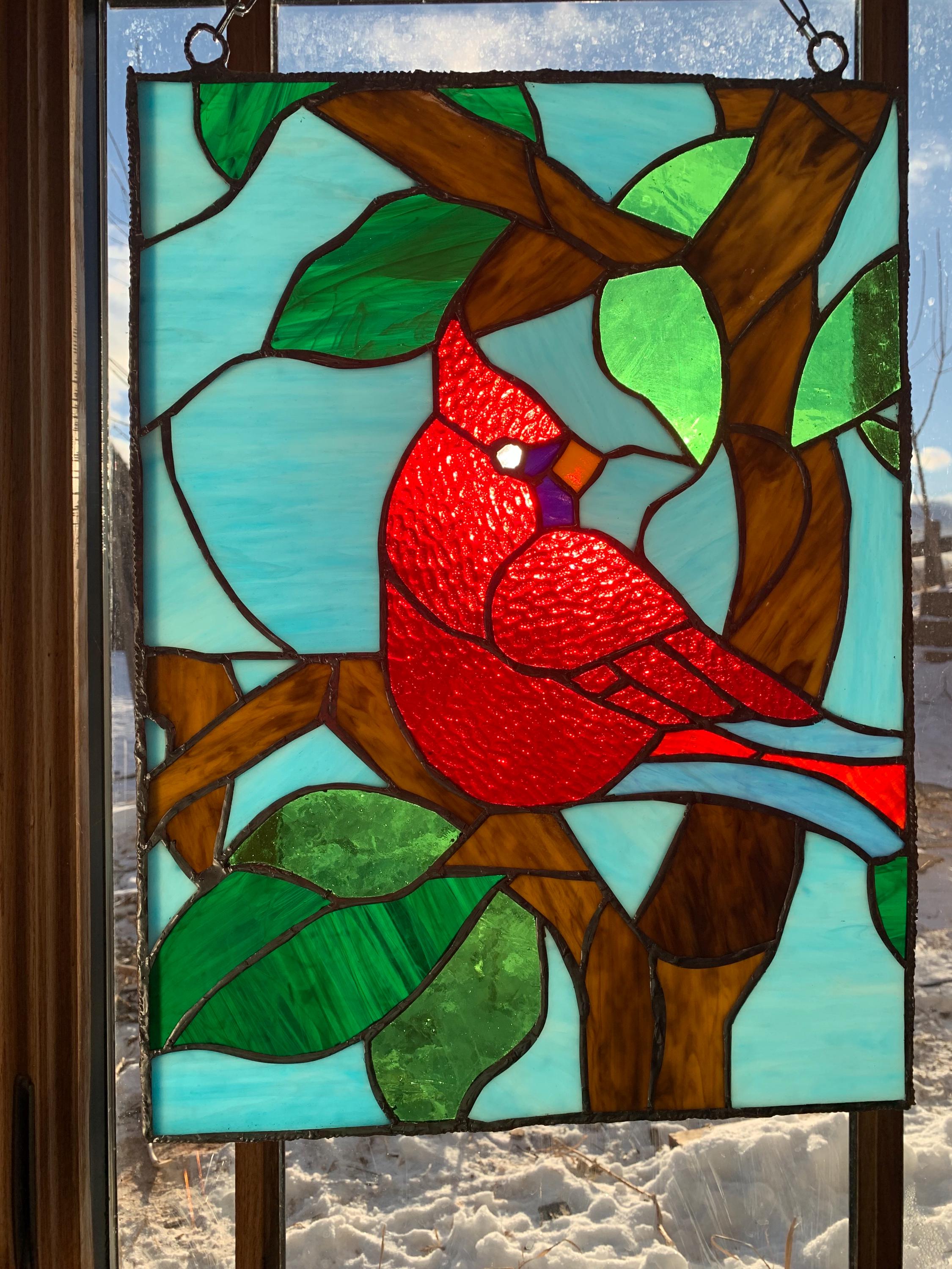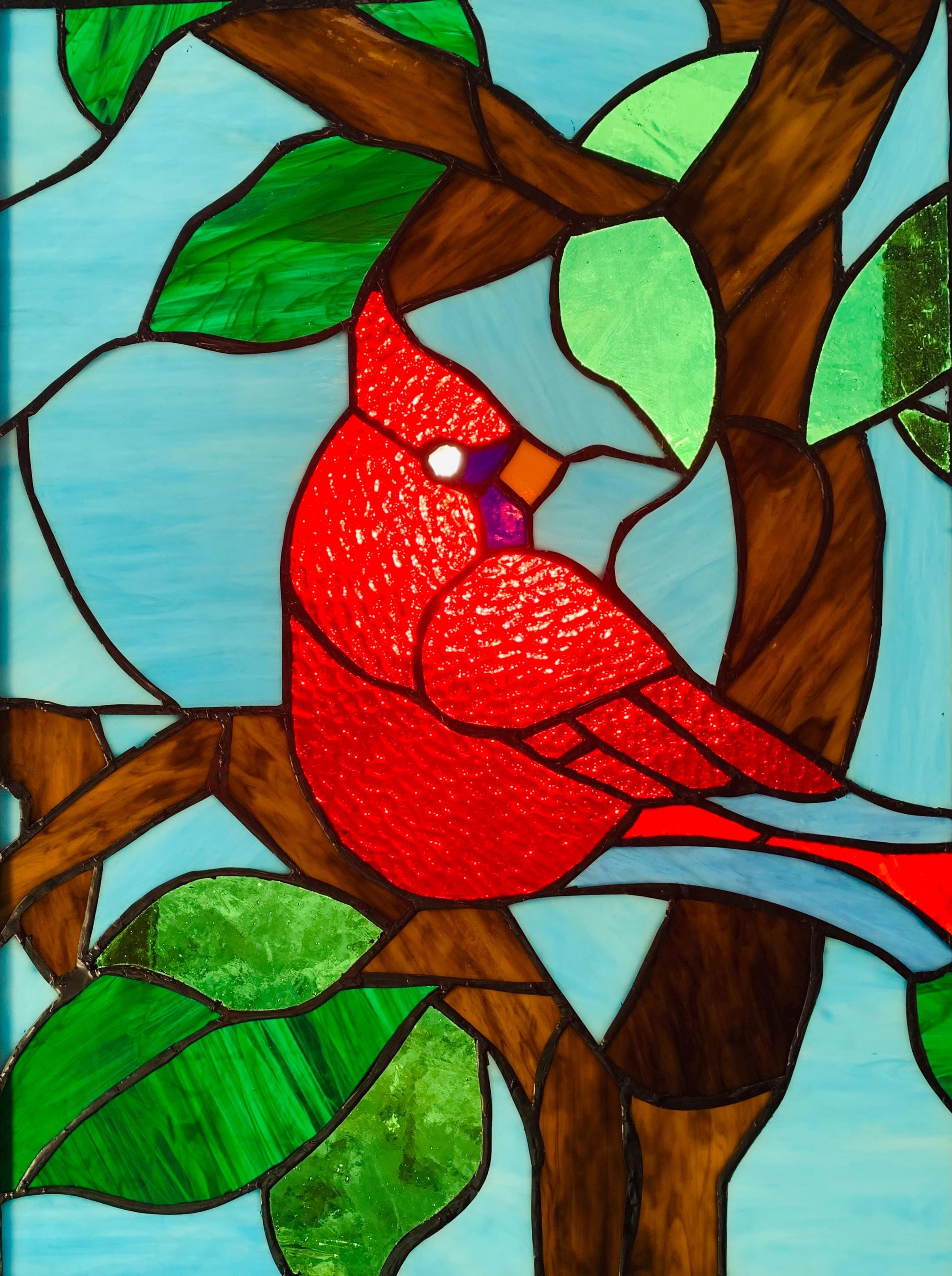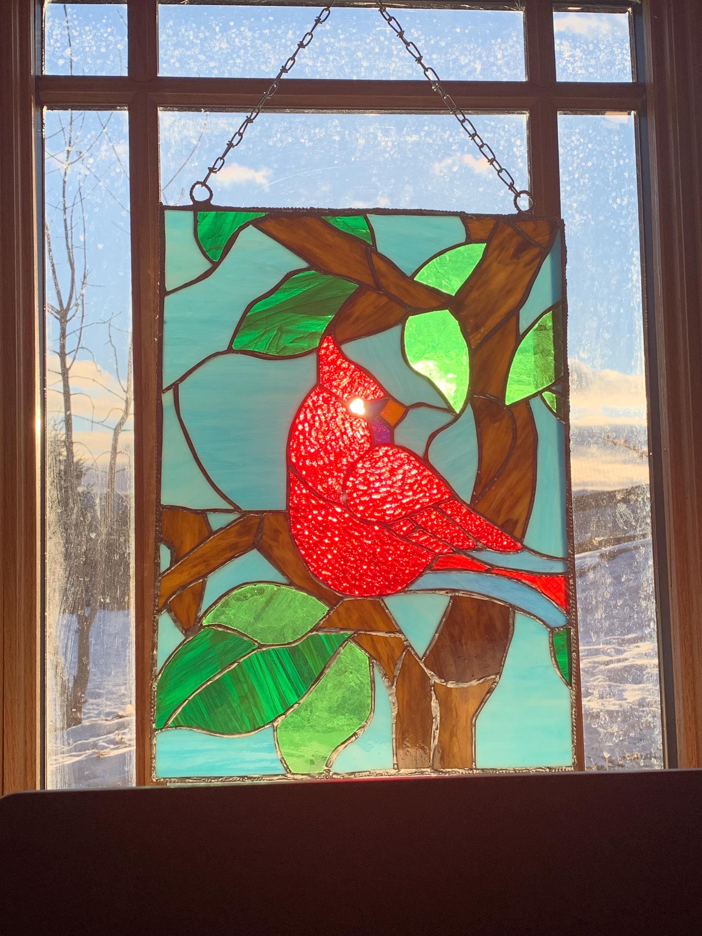 Handcrafted stained glass window panel featuring a vibrant red cardinal perched on a branch with leaves. This statement piece is designed to catch and transform natural light, bringing warmth, color, and a peaceful, nature-inspired feel into any space. Cardinals are often seen as symbols of love, remembrance, and hope, making this panel especially meaningful.