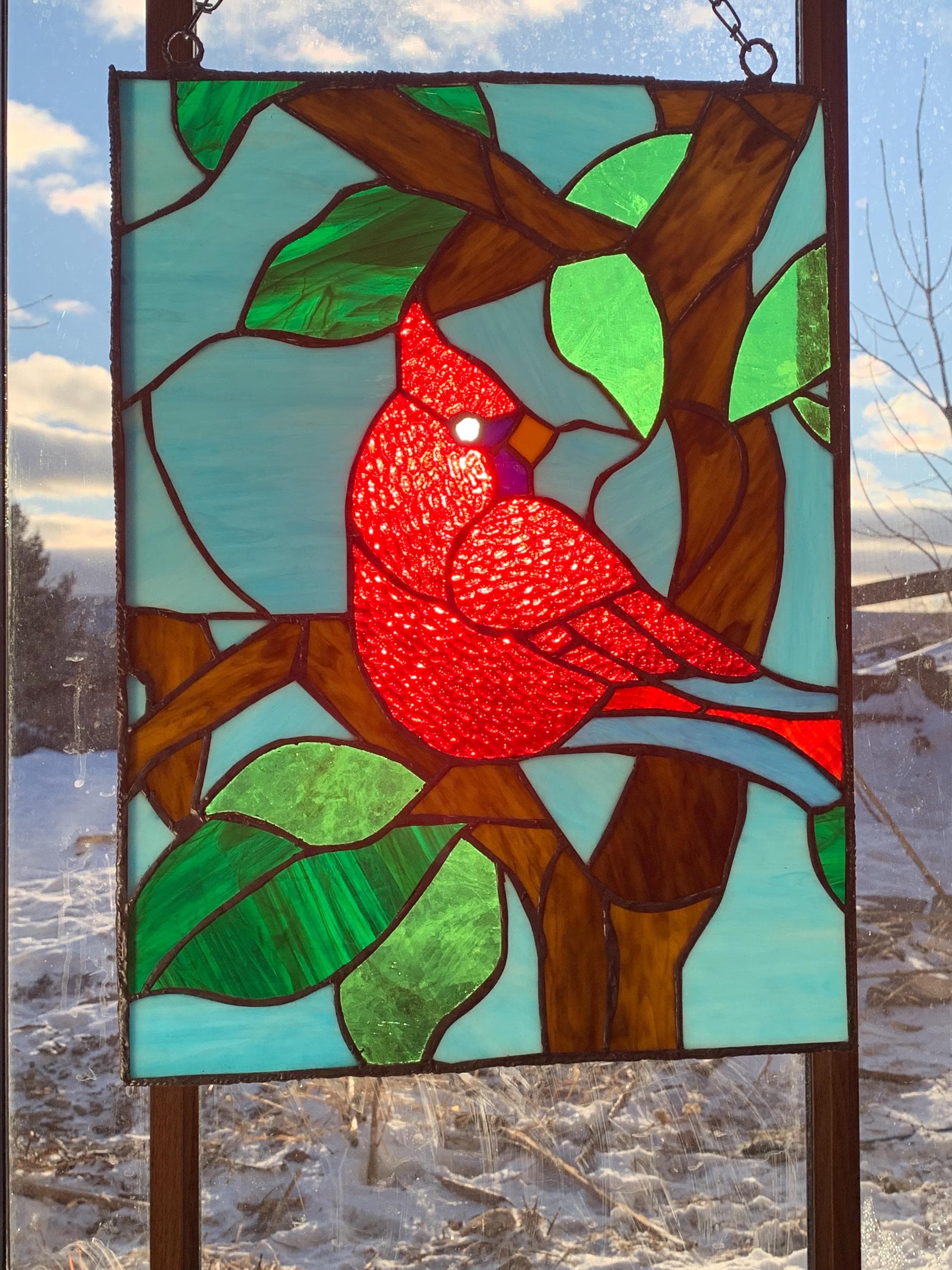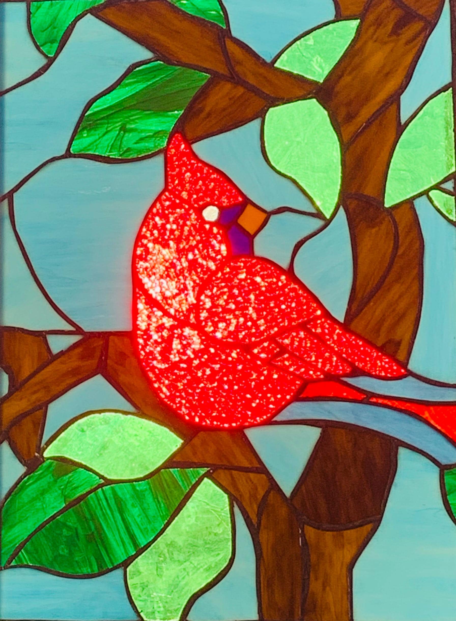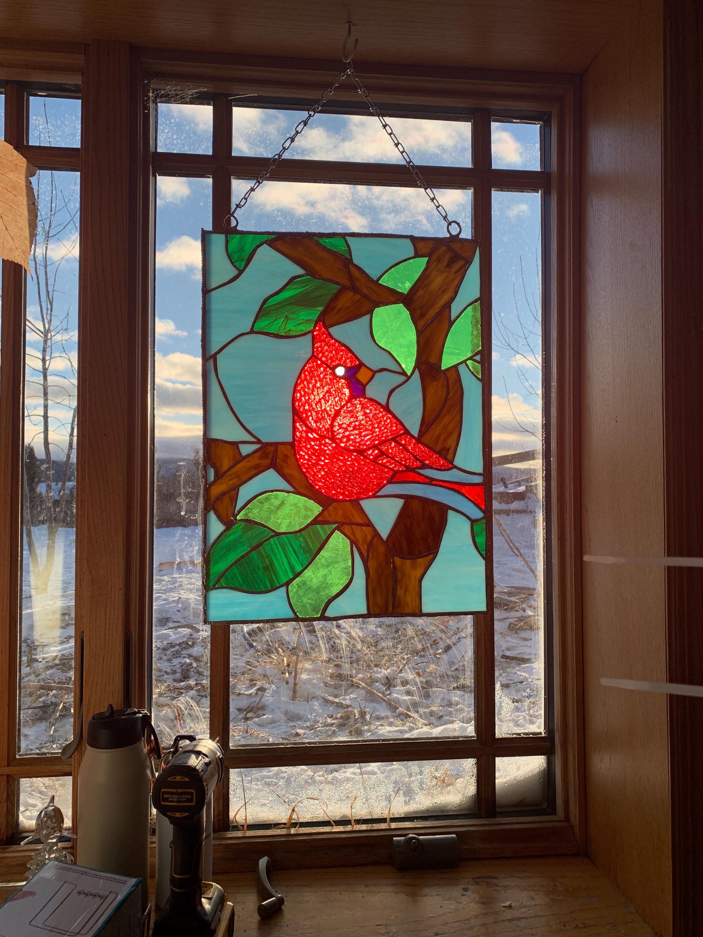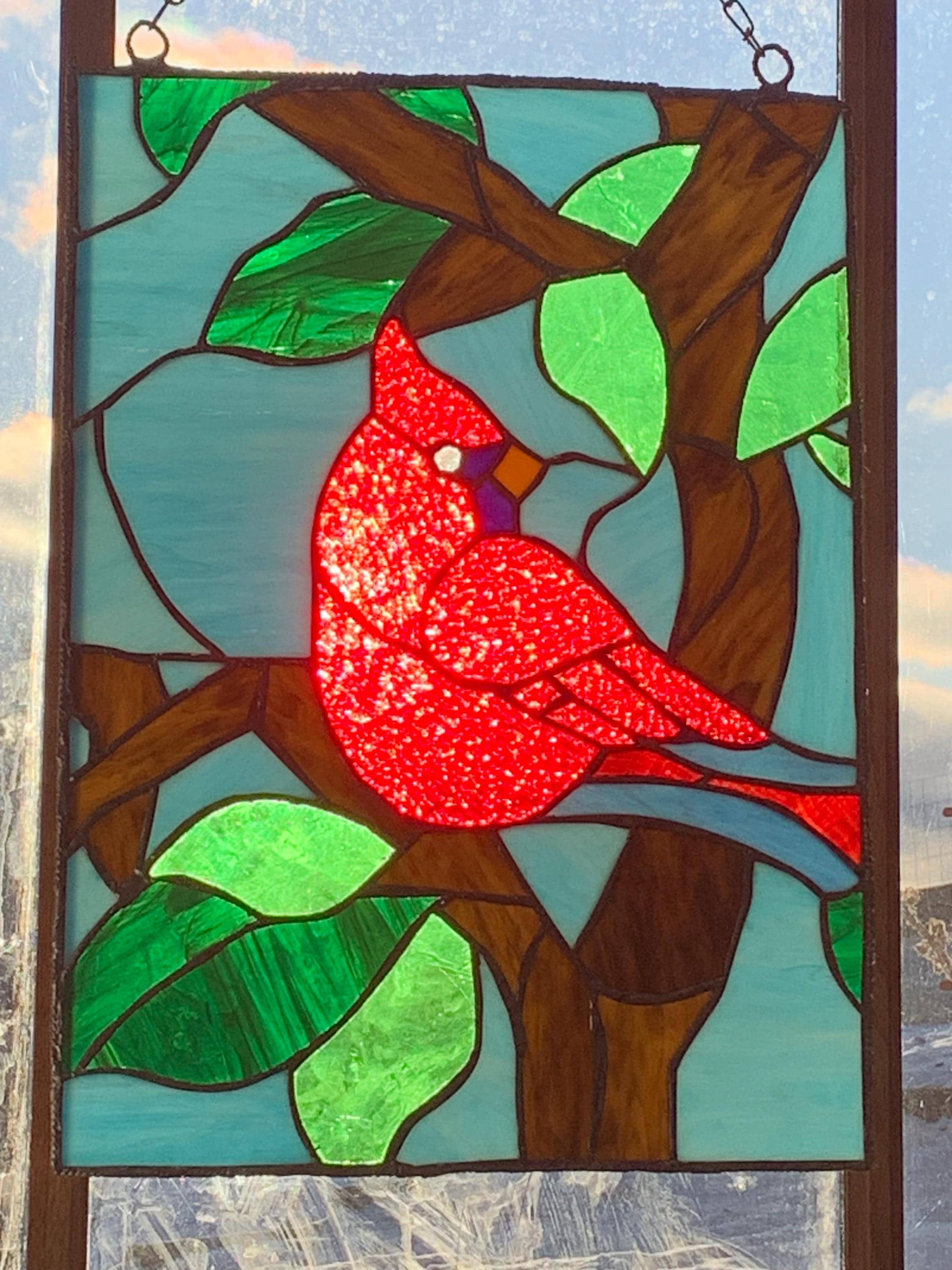 Handcrafted stained glass window panel featuring a vibrant red cardinal perched on a branch with leaves. This statement piece is designed to catch and transform natural light, bringing warmth, color, and a peaceful, nature-inspired feel into any space. Cardinals are often seen as symbols of love, remembrance, and hope, making this panel especially meaningful.