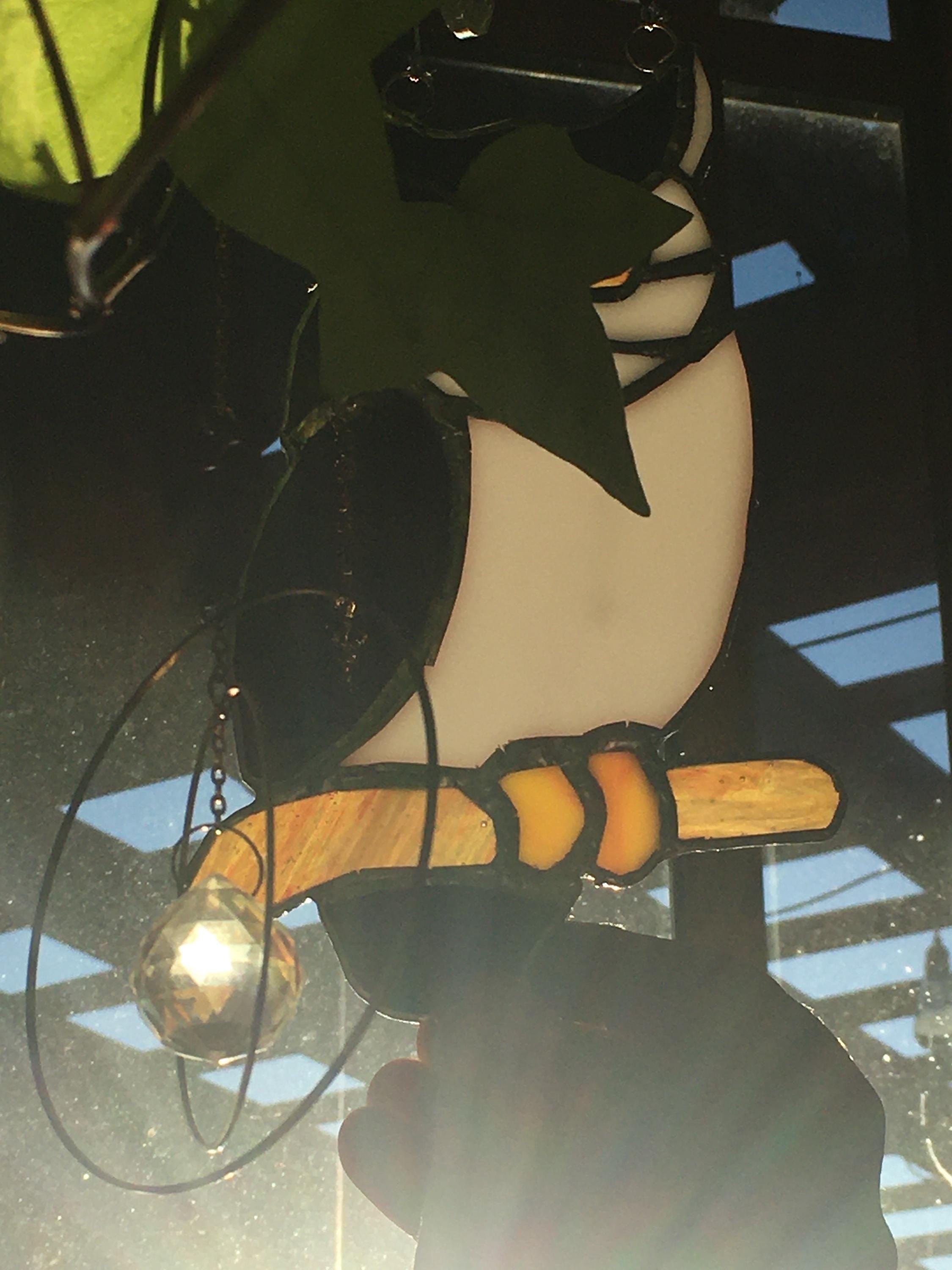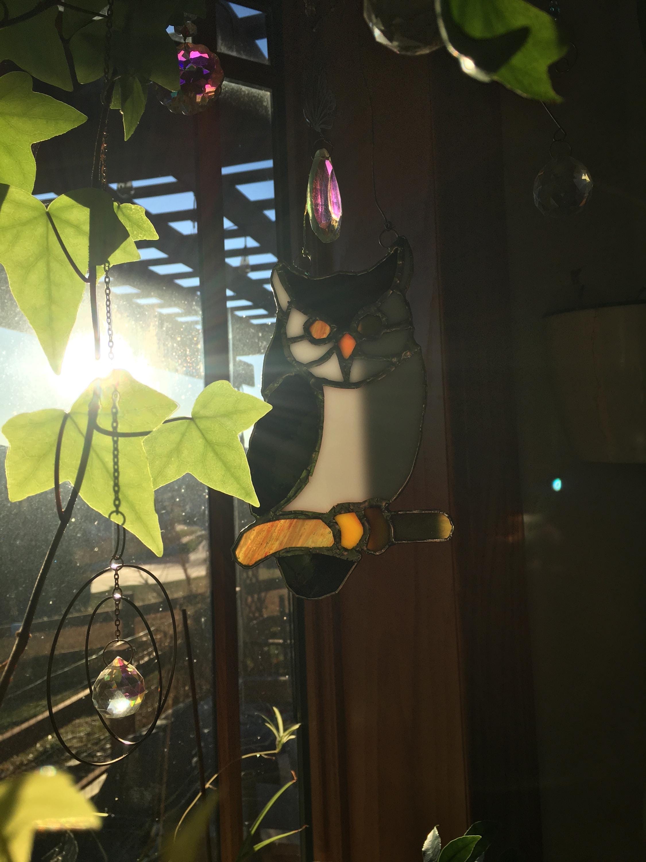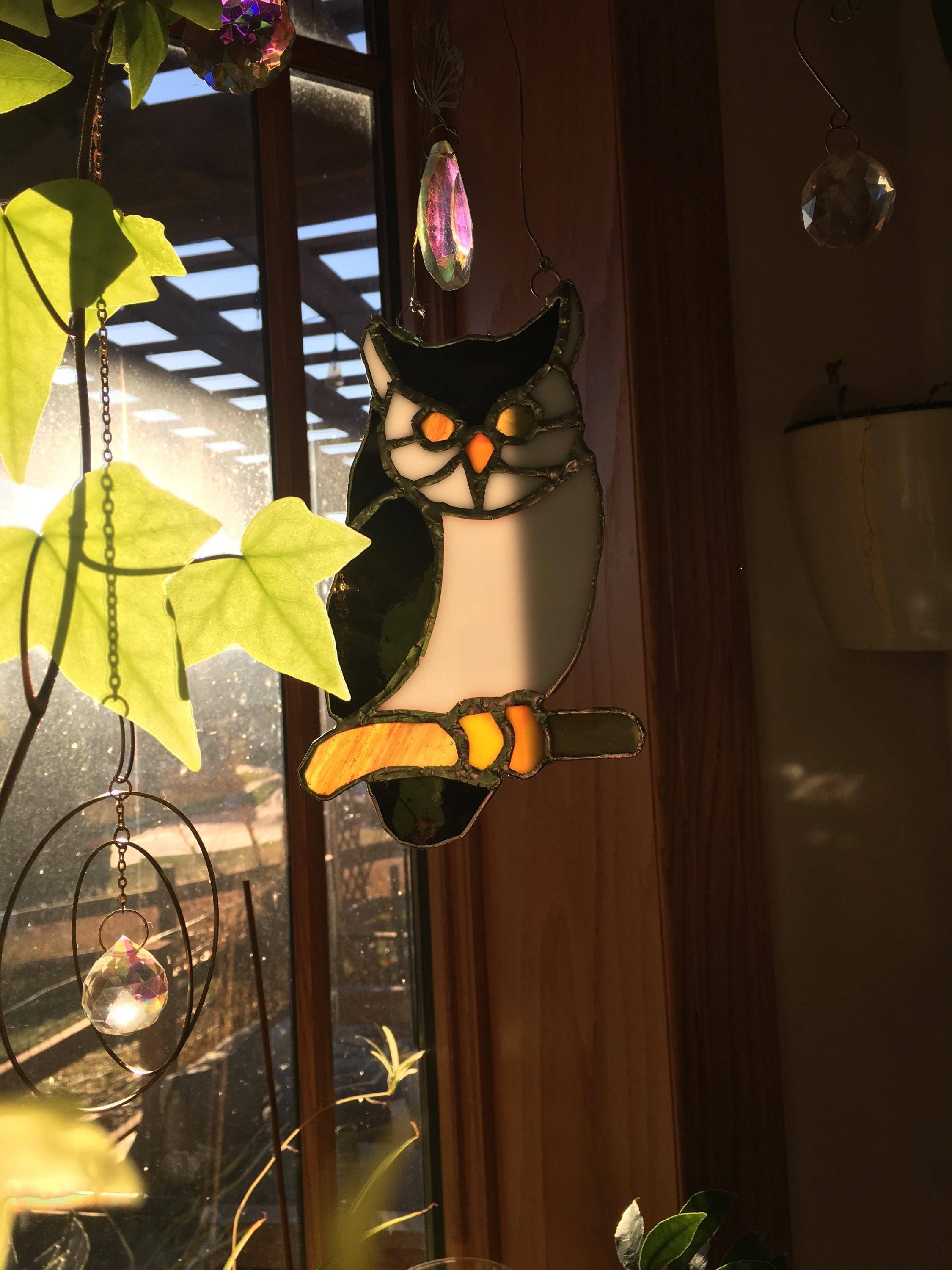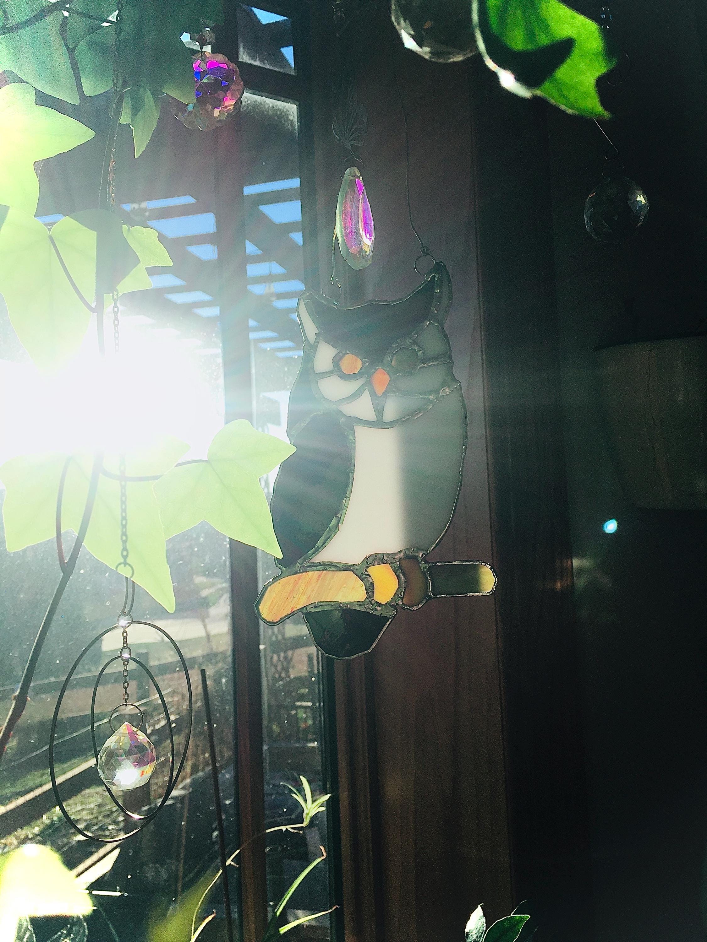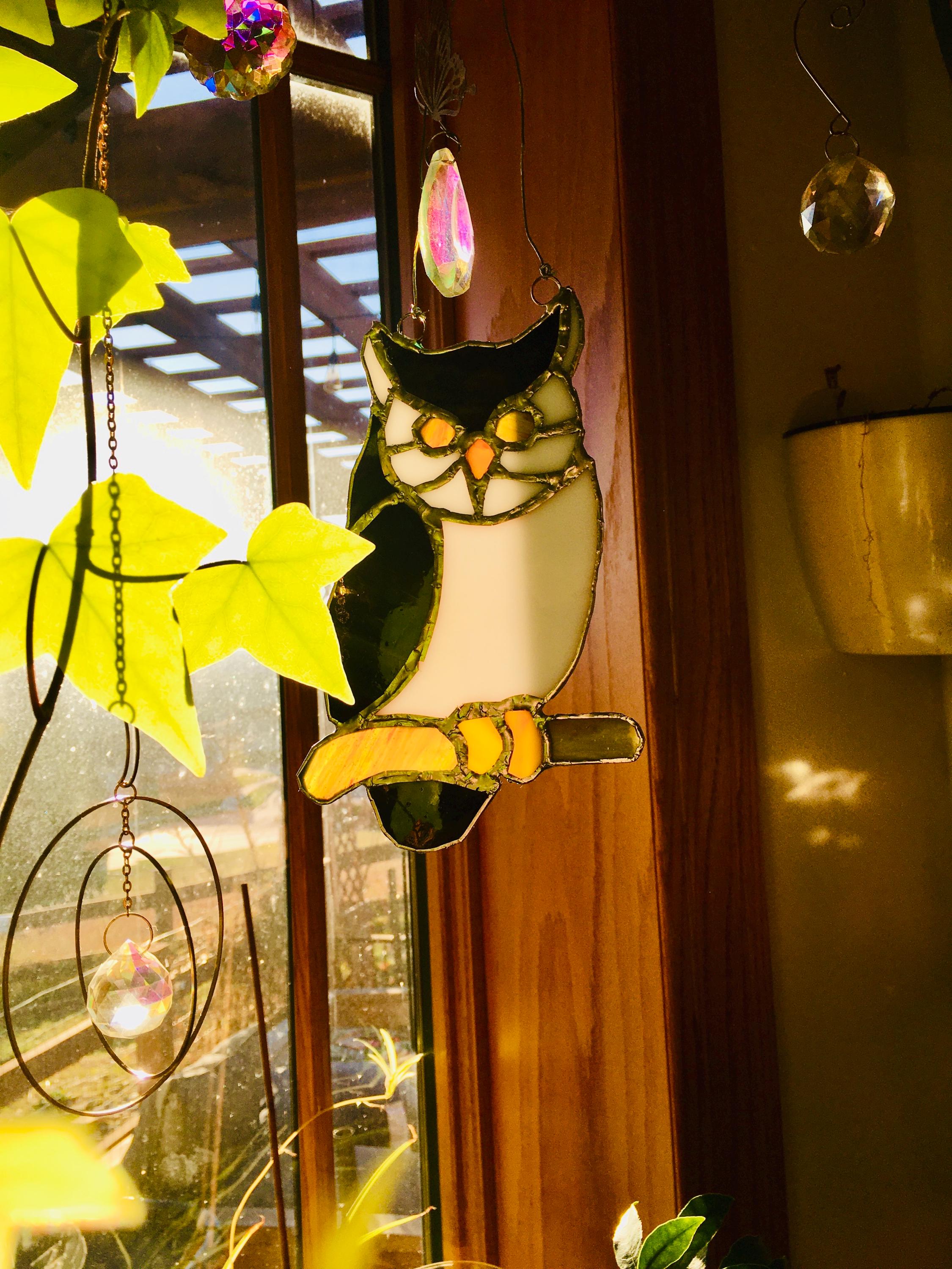 Handcrafted stained glass owl suncatcher featuring a simple, timeless owl perched on a branch. A warm, nature-inspired accent that catches the sunlight beautifully, perfect for a window or any indoor space where natural light can shine through.