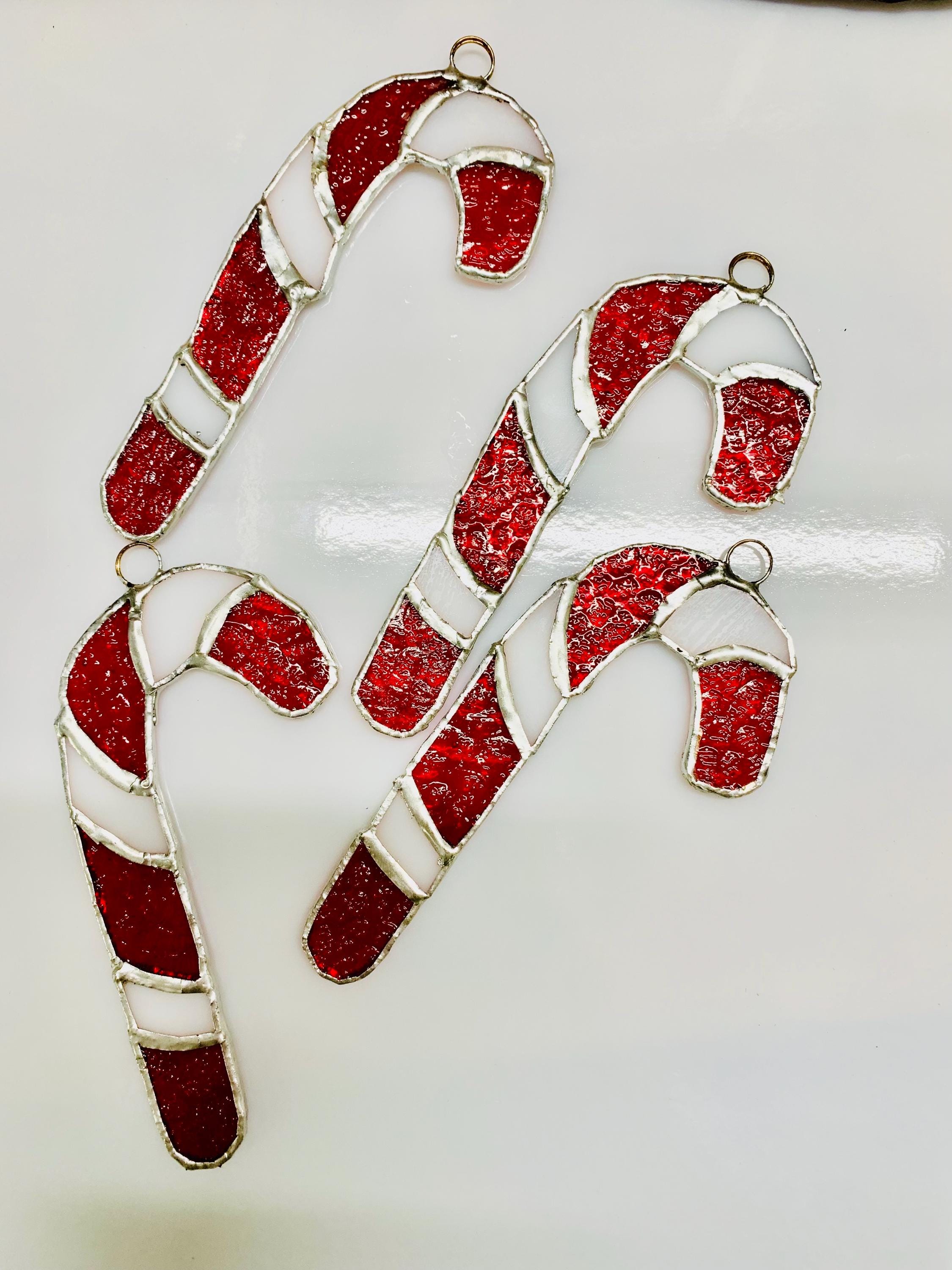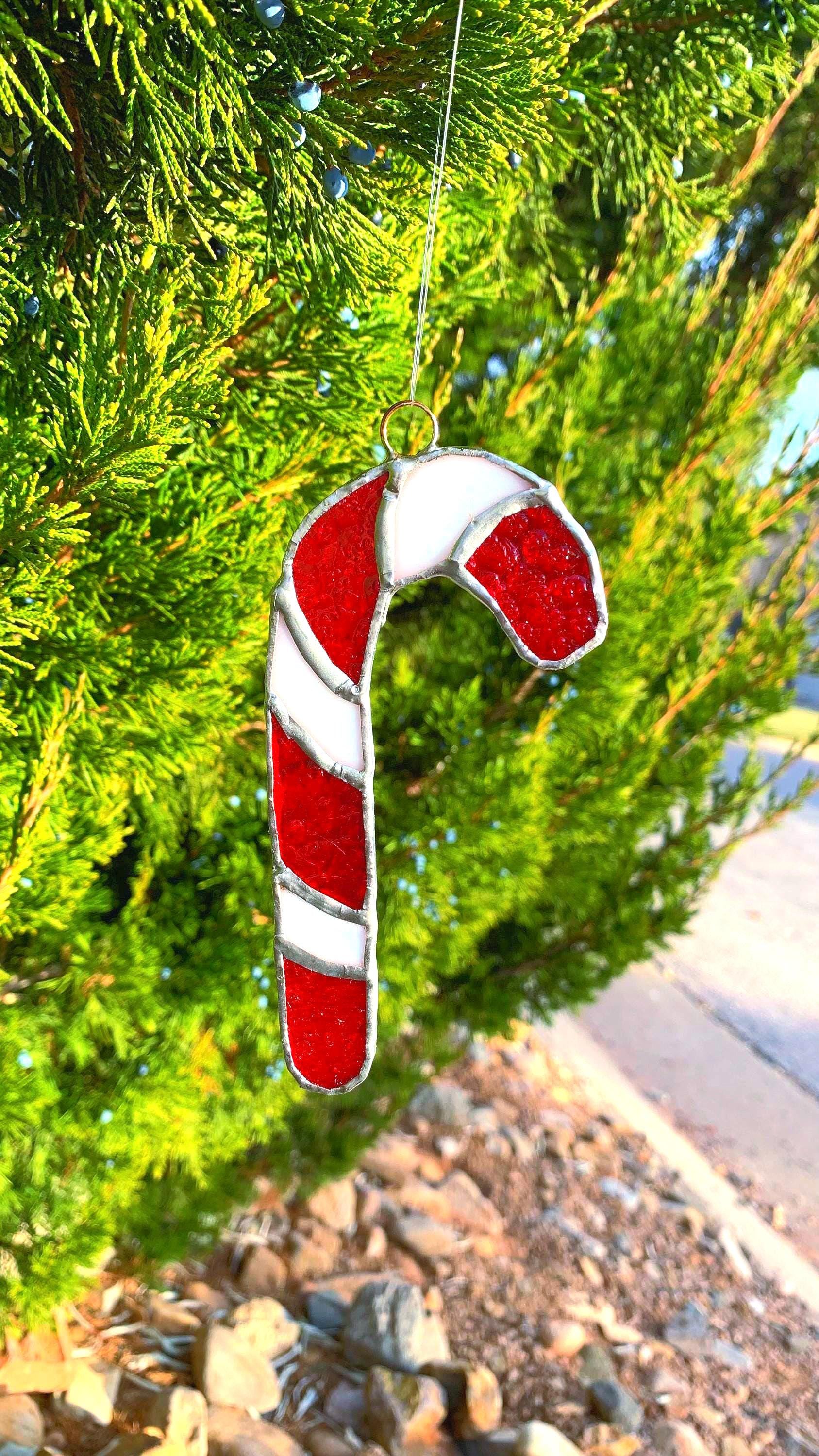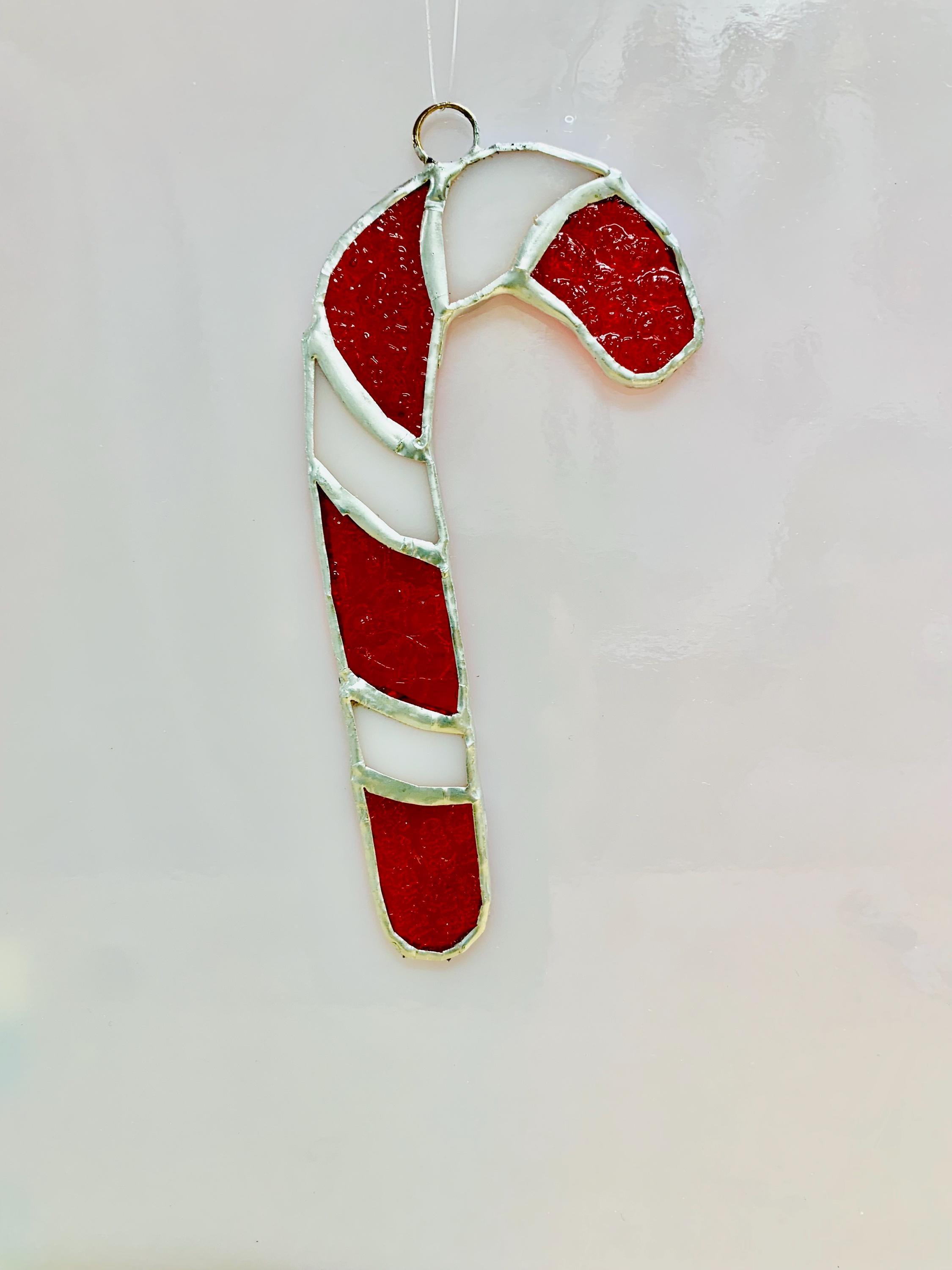 Handcrafted stained glass candy cane ornament. Classic red-and-white holiday treat that glows beautifully in a window or on the tree.